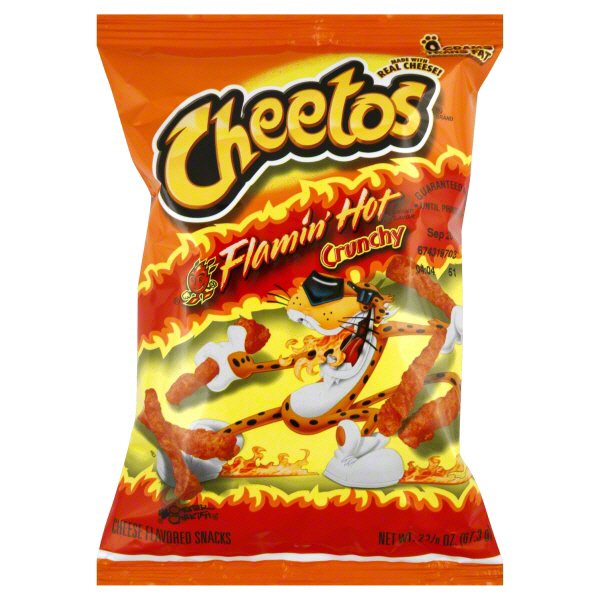 Solved 1. find a nutrition label of hot cheetos.3. if the | Chegg.com Science; Biology; Biology questions and answers; 1. find a nutrition label of hot cheetos.3. if the serving size is more than one, do you find yourseld eating more than one serving?4. describe the overall macromolecules categories and descibe this item's nutritional value. how does it compare to the percent daily value table? explain.answer all correctly will rate. Hot Cheetos Teaching Resources | Teachers Pay Teachers Domain-Specific Vocabulary RI.4.4 | Flamin' Hot Cheetos Richard MontaƱez #4-7. by. Lovin Lit. 58. $3.95. Zip. Nonfiction Article of the Week Club, Article #4-7: Flamin' Fame: The True Story of Richard MontaƱezThis is the seventh in a set of 25 informational text articles + activity packs designed to teach ALL of the reading informational text ... Hot Cheetos Food Label - Healthy Teps Each serving of hot cheetos contains about 2 grams of protein and 15 grams of carbohydrates or 5 per cent of the recommended daily allowance. A serving contains less than 1 gram of dietary fibre and has no sugar or fat. Regardless of their nutritional content, Hot Cheetos are an excellent choice for those seeking an energy boost. CHEETOS® Crunchy FLAMIN' HOT® Cheese Flavored Snacks | Cheetos Description Hot, spicy flavor packed into crunchy, cheesy snacks. CHEETOS ® Crunchy FLAMIN' HOT ® Cheese Flavored Snacks are full of flavor and made with real cheese. Nutrition Facts Ingredients Buy Now Buy Now CHEETOS® Crunchy FLAMIN' HOT® Cheese Flavored Snacks (opens a popup) Product Reviews ★★★★★ ★★★★★ 4.0 8 Reviews