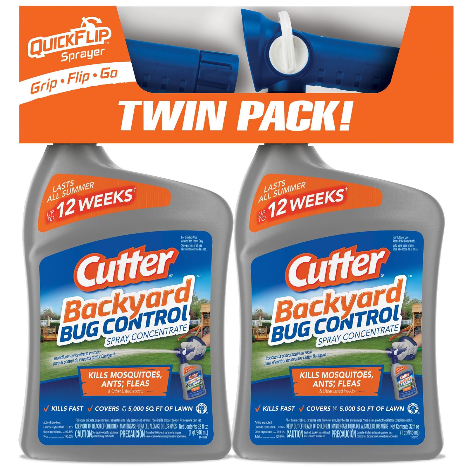 Cutter Backyard Ready To Use, 32 oz, Twin Pack Cutter Backyard Bug Control Spray Concentrate kills fast and lasts all summer, providing up to 12 weeks of control against house crickets, carpenter ants, harvester ants, lady beetles and earwigs. Includes the QuickFlip hose-end sprayer, which activates spray at the flip of a switch. For best results, apply early before insect populations are high.
