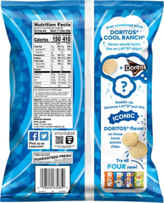 Doritos Cool Ranch Tortilla Chips Nutrition Facts Doritos Cool Ranch Tortilla Chips contains the following ingredients: Corn, vegetable oil (corn, canola, and/or sunflower oil), and 2% or less of the following: salt, corn starch, tomato powder, lactose, whey, skim milk, onion powder, sugar, garlic powder, monosodium glutamate, maltodextrin (made from corn), cheddar cheese (milk, cheese ... Doritos Cool Ranch 1 3/4 oz Calories, Carbs & Nutrition Facts ... Find calories, carbs, and nutritional contents for Doritos Cool Ranch 1 3/4 oz and over 2,000,000 other foods at MyFitnessPal. LOG MASUK Daftar. Perihal. Makanan. Senaman. Aplikasi. Masyarakat. Blog. Doritos Chips Nutrition | livestrong Oct 23, 2019 · 18 grams of carbohydrates 1 gram of dietary fiber Less than 1 gram of sugar 2 grams of protein 40 milligrams of calcium 50 milligrams of potassium For comparison's sake, Frito-Lay Cool Ranch nutrition facts are: 150 calories 8 grams of fat, 1 gram of which is saturated fat. There are no trans fats. 180 milligrams of sodium 18 grams of carbohydrates