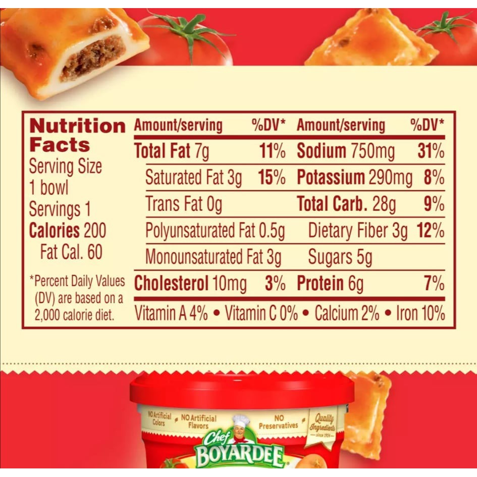 Calories in Chef Boyardee Ravioli - Calorie, Fat, Carb, Fiber ... Calories in Chef Boyardee Ravioli based on the calories, fat, protein, carbs and other nutrition information submitted for Chef Boyardee Ravioli. Calories in Chef Boyardee Beef Ravioli and Nutrition Facts - FatSecret Chef Boyardee Beef Ravioli Nutrition Facts Serving Size 1 cup (246 g) Amount Per Serving Calories 220 % Daily Values* Total Fat 7.00g 9% Saturated Fat 2.500g 13% Trans Fat 0.000g Cholesterol 10mg 3% Sodium 750mg 33% Total Carbohydrate 31.00g 11% Dietary Fiber 3.0g 11% Sugars 5.00g Protein 7.00g Vitamin D - Calcium - Iron - Potassium 870mg 19%