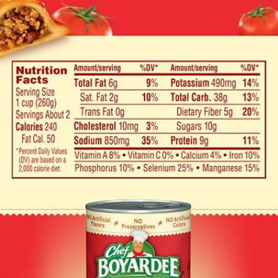 Nutrition Facts for Chef Boyardee Overstuffed Beef Ravioli in Pasta ... Chef Boyardee Overstuffed Beef Ravioli in Pasta Sauce Canned. Nutrition Facts. Serving Size. cup. 1 cup = 260g. Amount Per Serving. 180. ... (DV) tells you how much a nutrient in a serving of food contributes to a daily diet. 2,000 calories a day is used for general nutrition advice. 29 Net Carbs Per Serving Add to Food Diary. Eat better. Feel ...