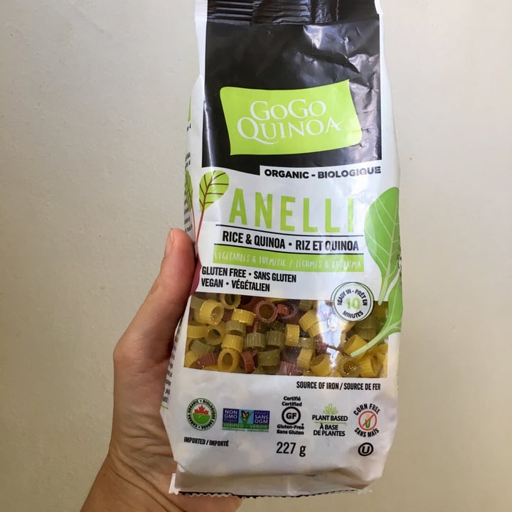 GoGo Quinoa Calories and Nutrition Information. Page 1 Calories and nutrition information for GoGo Quinoa products. Page 1. Calories and nutrition information for GoGo Quinoa products. Page 1. Toggle navigation Toggle search bar. App ... lentil pasta & vegan cheese. 0.5 box : 310: Mac & Vegan Cheese Macaroni. 0.5 box : 310: Macaroni, Red and White Quinoa. 56 g : 200: Gogo Quinoa Macaroni, Red And White Quinoa, Organic: Calories ... Nutrition Serving Size: 1/2 cup (55 g) dry Amount per Serving My Daily Value Calories 210 Kcal 12% Total Fat 1 g 2% Saturated Fat 0.3 g 2% Trans Fat 0 g 0% Cholesterol 0 mg 0% Sodium 0 mg 0% Potassium 95 mg 2% Total Carbohydrate 45 g 19% Dietary Fiber 4 g 16% Sugars 1 g 1% Added Sugars 0 g 0% Protein 5 g 10% Calcium 6 mg 1% Iron 1 mg 6% Gogo Quinoa Macaroni: Calories, Nutrition Analysis & More - Fooducate Choose healthy pasta - 5 quick tips Want to choose healthy pasta? Here are 5 quick tips: 1. Choose whole grain pasta. One serving will have 3.5 grams of fiber while regular pasta has 2 grams. 2. Cook it al dente (firm) - the firmer the pasta, the lower the glycemic index. Low glycemic index means longer lasting energy and easier digestion. 3. GoGo Quinoa | Taste the well-being | Products, Recipes, Shop Organic Made with high quality, plant-based ingredients Gluten and peanut free GMO free Kosher certified Plastic neutral Nutritious And always delicious! Our mission At GoGo Quinoa, everything we do, we do with heart. It's a matter of respect for our customers, for Mother Nature, and for the farmers with whom we work.